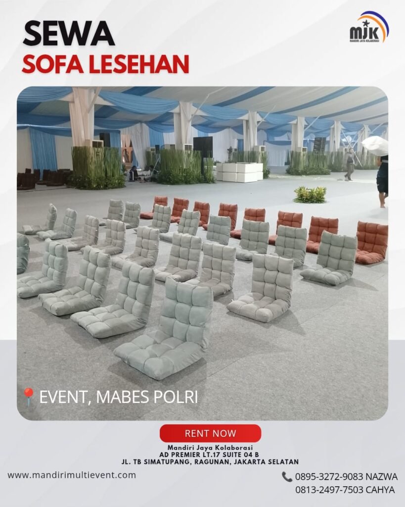 Tidak hanya itu, mandiri jaya kolaborasi juga melayani pemesanan dalam jumlah besar untuk berbagai event skala besar. Tim kami telah mendukung berbagai kegiatan penting termasuk event di mabes polri ini yang menggunakan sofa lesehan dalam jumlah banyak. Pengalaman tersebut menunjukan bahwa kami mampu menyediakan perlengkapan event secara profesional dan terpercaya.